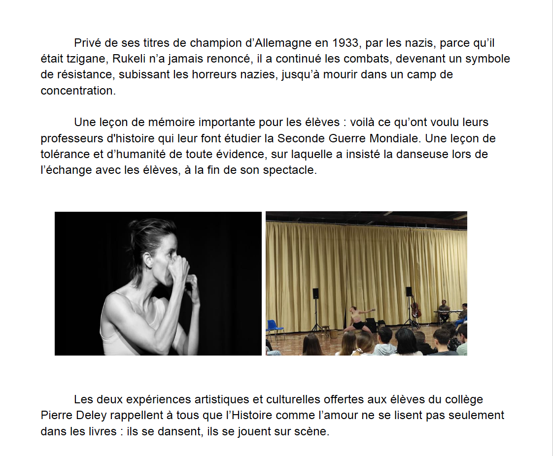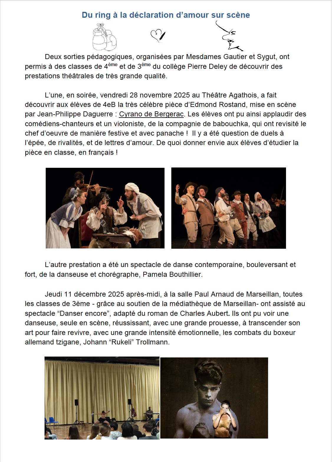 Deux sorties pédagogiques, organisées par Mesdames Gautier et Sygut, ont permis à des classes de 4ème et de 3ème du collège Pierre Deley de découvrir des prestations théâtrales de très grande qualité.